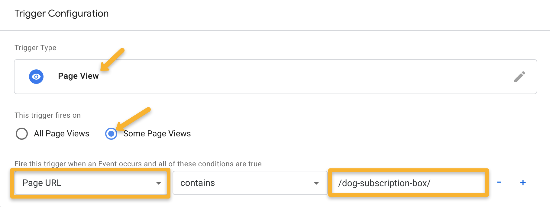 Finally, select “Page View” as the Trigger Type. Choose “Some Page Views”, then select “Page URL” and “Contains”.