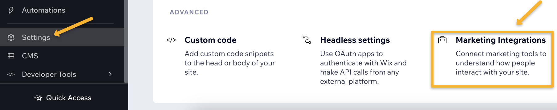Next, in Wix, go to “Settings”, then “Marketing Integrations”.