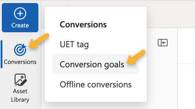 In your Microsoft Ads dashboard, click on “Conversions” and then “Conversion Goals”:
