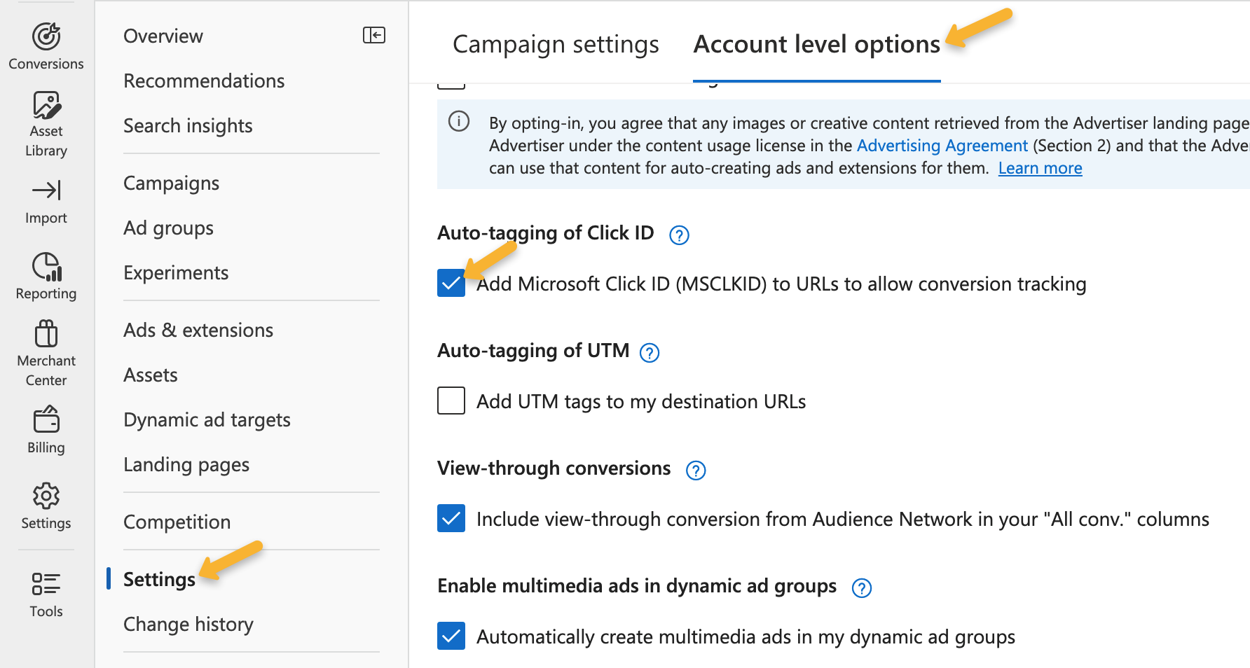 Before you get started, make sure you have auto-tagging turned on in your Microsoft Ads account by going to Campaigns > Settings > Account level options and check the “Add Microsoft Click ID (MSCLKID) to URLs” box.