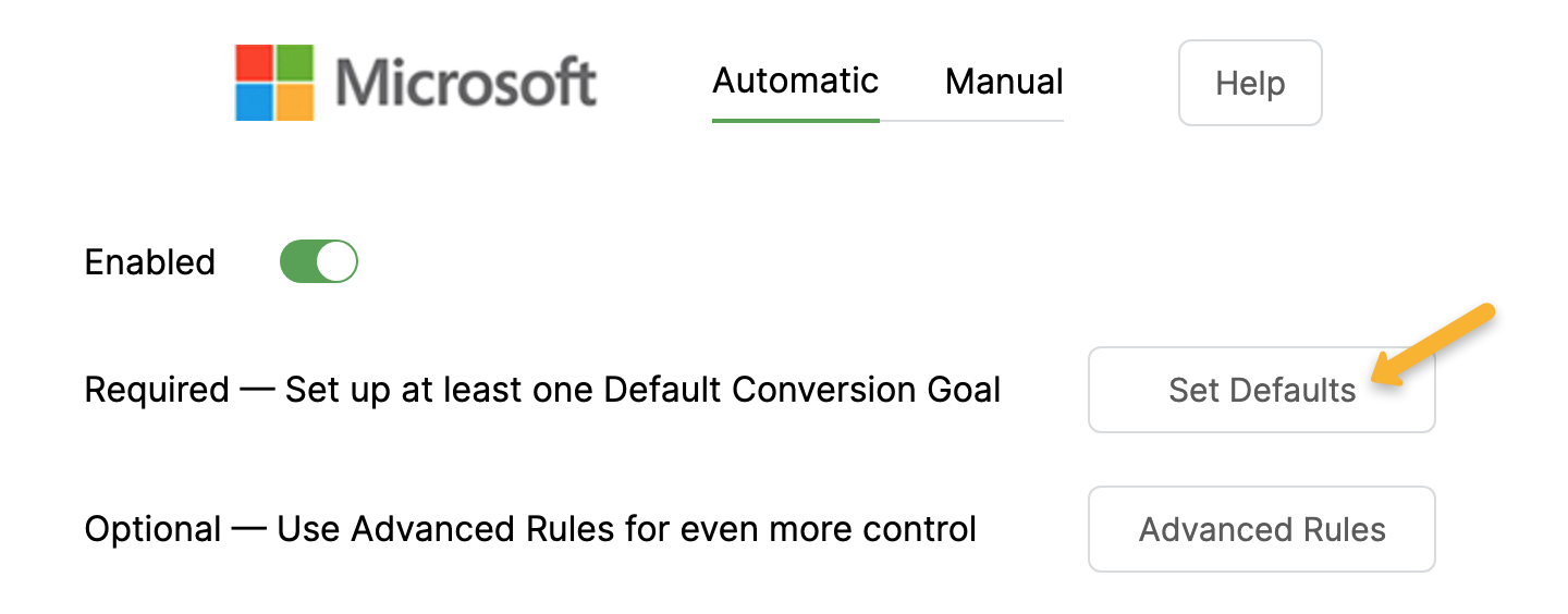 Caution: If you select any other option besides “Offline” for conversion type, Audience Optimization will not work within ClickMagick. You will have the ability to enable the automated option for Microsoft Ads, but it will not allow you to click any of the buttons for defaults or advanced rules. If this happens to you, you will need to go back and check your Conversion Goals within your Microsoft ad account and make sure you have a conversion goal with type “Offline”.