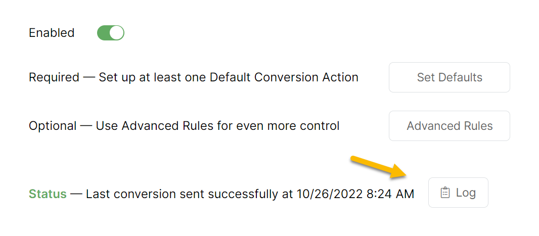 There are no delays on our end, and you can see the results of every conversion we’ve sent by clicking on the Log button: