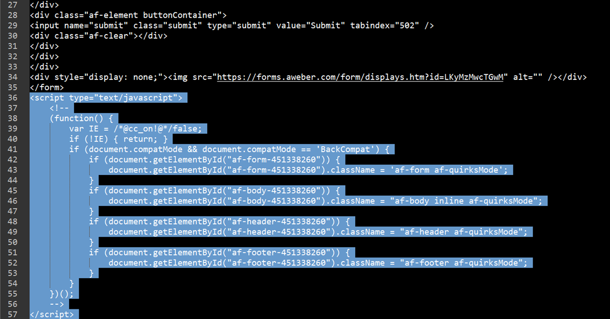 7. Once you have pasted it into a notepad app, look for the JavaScript portion at the end of the script and remove it. See below for the exact highlighted portion: