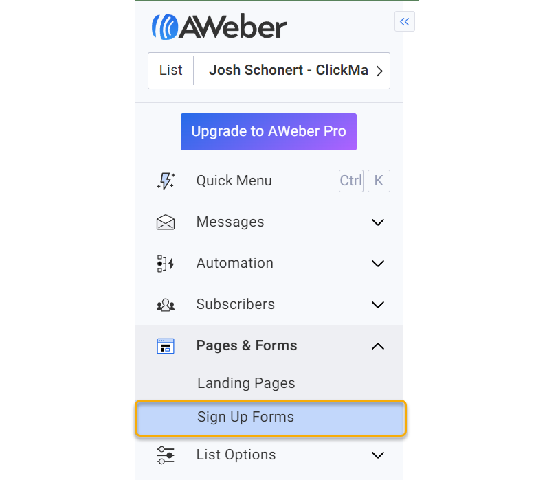 1. In Aweber, click on the Pages & Forms menu, then click on “Sign Up Forms”.