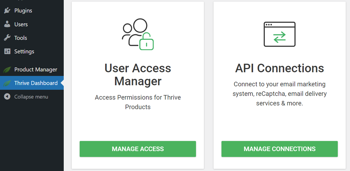 2. Click on the Thrive Dashboard on the left, and then click “Manage Connections” in the “API Connections” box.