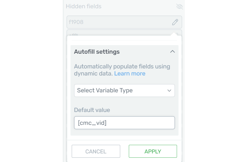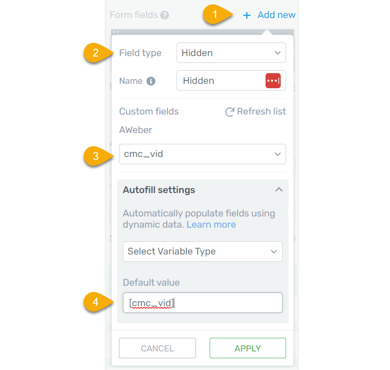 4. Click the “Add new” button to add a new field to the form. Choose “Hidden” as the type, and select the custom cmc_vid field from the dropdown list, and then set up the Autofill settings so that the default value is “[cmc_vid]”.