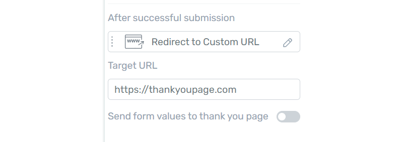7. In the section “After successful submission”, use the option “Redirect to Custom URL” and then put your thank you page URL into the box for “Target URL”.