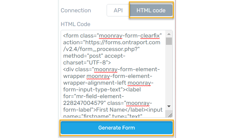 2. Click “HTML code” on the left, add your code to the box, and click “Generate Form”.