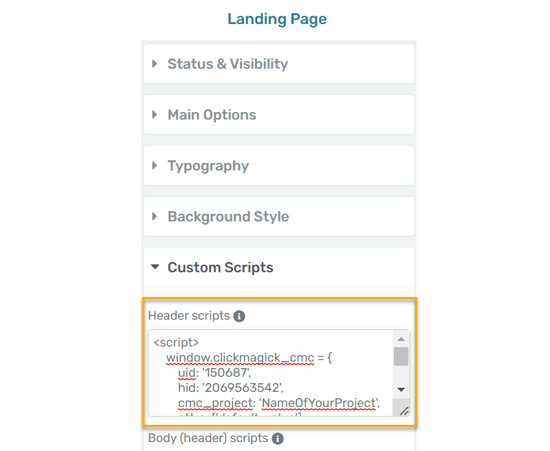 4. Add your modified tracking code into the “Header scripts” box and save your changes.