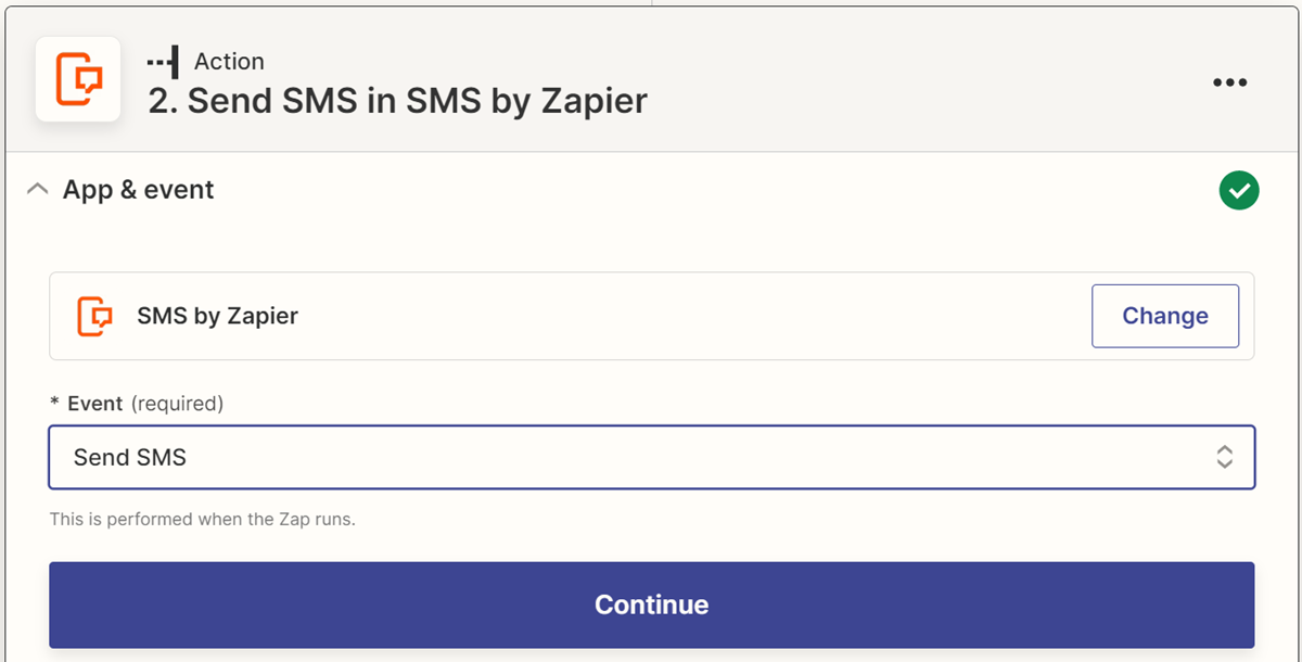Choose the action event, which is going to be "Send SMS" and click continue.