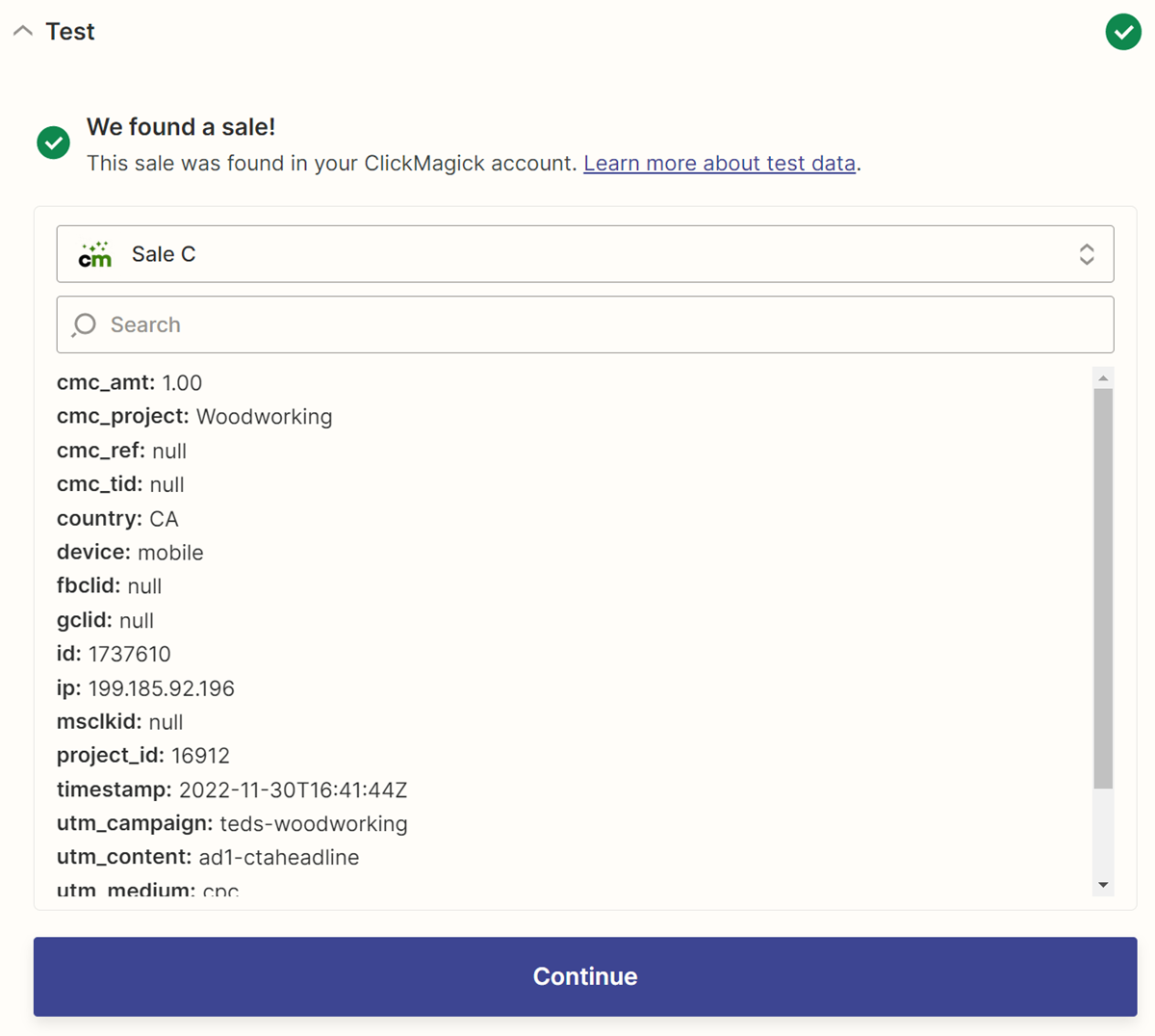 There are lots of ClickMagick “Triggers” in Zapier that you can use in your “Zaps” for Clicks, Actions, Engagements and Sales.