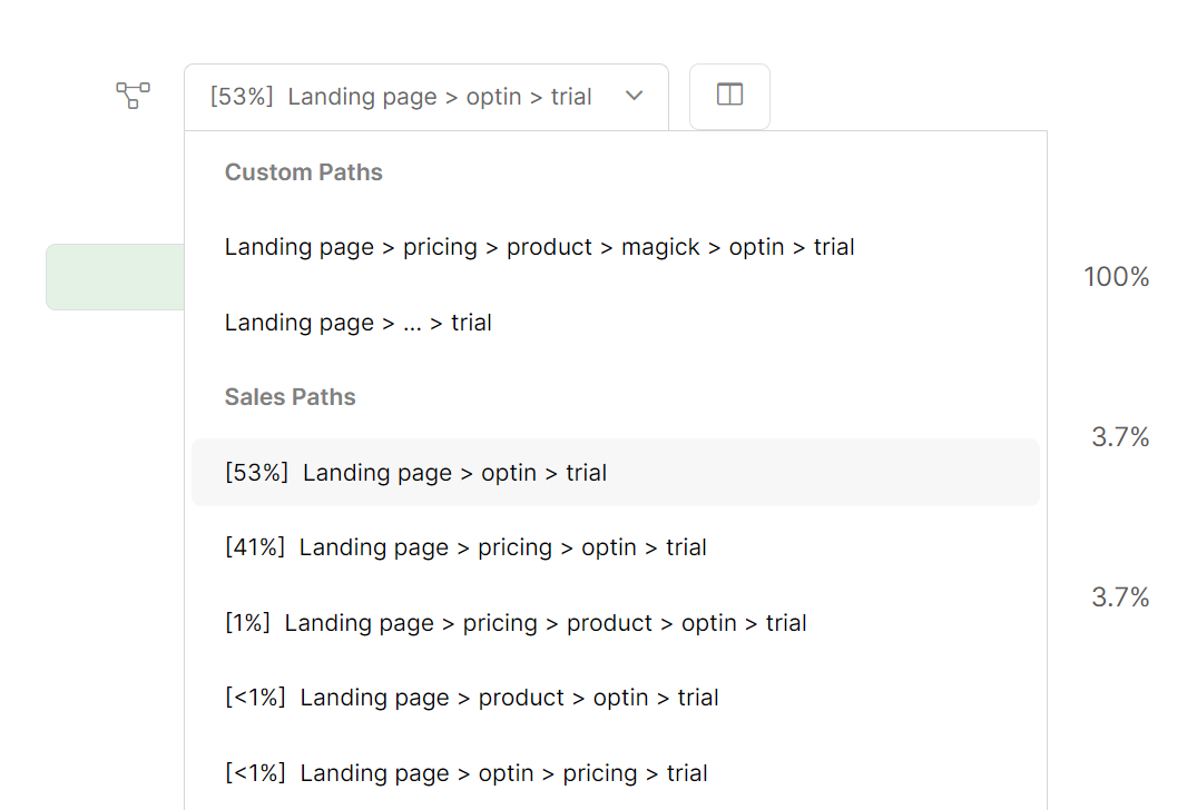 You’ll automatically see the common paths visitors take through your funnel, sorted from most to least profitable. The percentage in front of each sales path tells you the percentage of visitors who took that path.