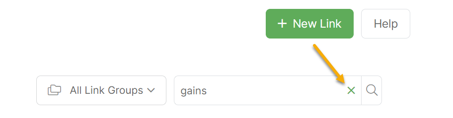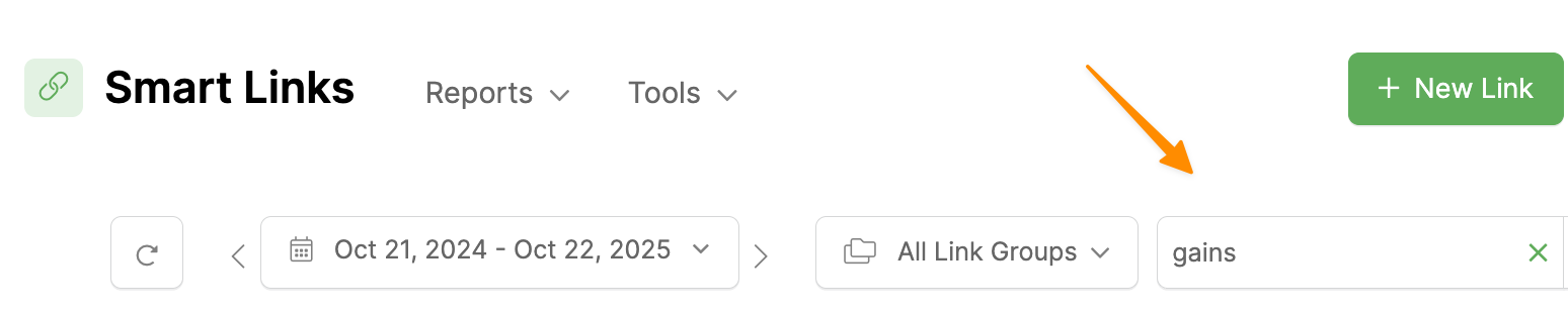 Even though we have a lot of Smart Links, none have “gains” in the Link Name, Link Slug, or Primary URL – which is why no links are showing up.