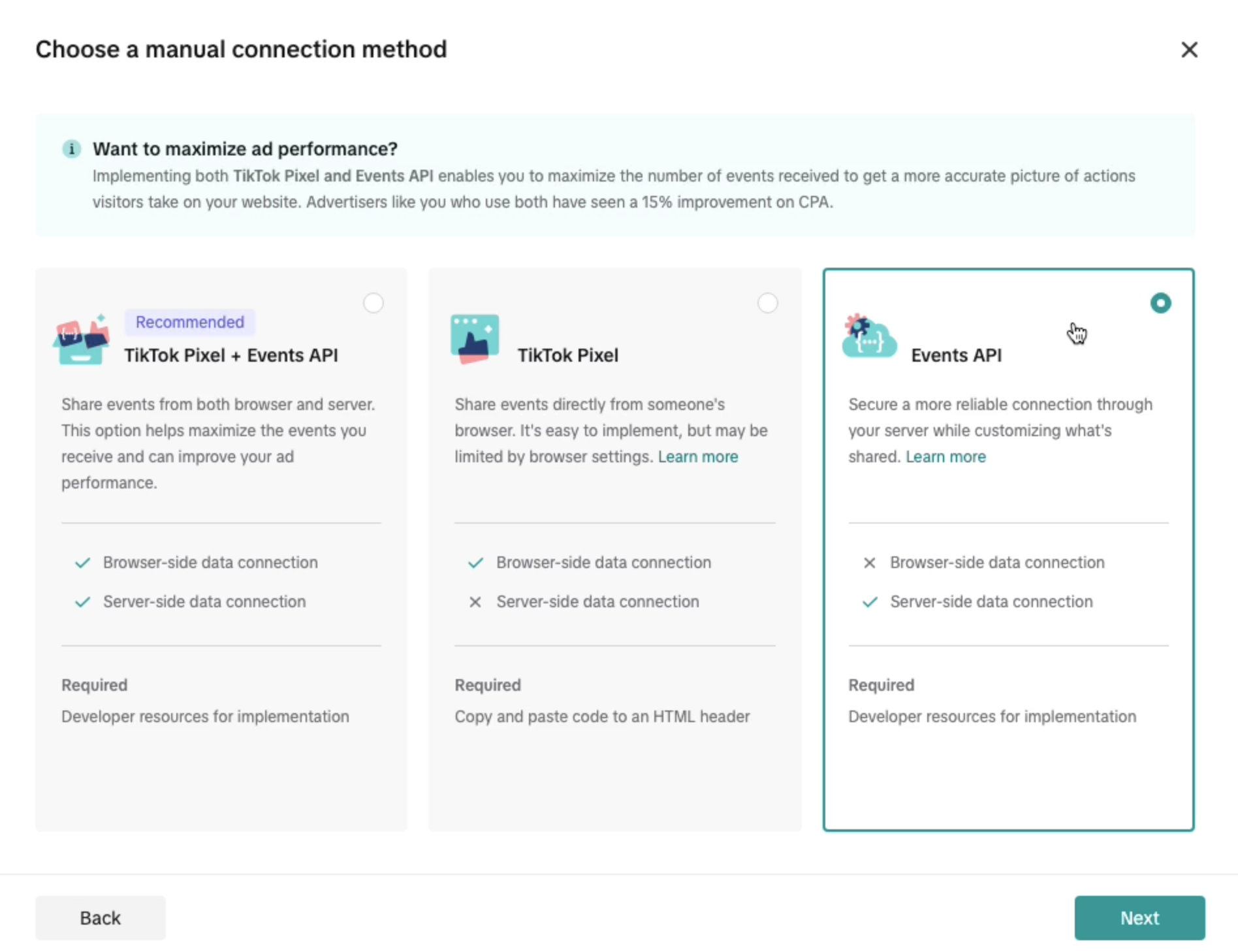 Finally, in TikTok Events Manager, verify that your new server-side events are appearing under the Events API connection and that no unexpected browser-side conversion events are showing up.