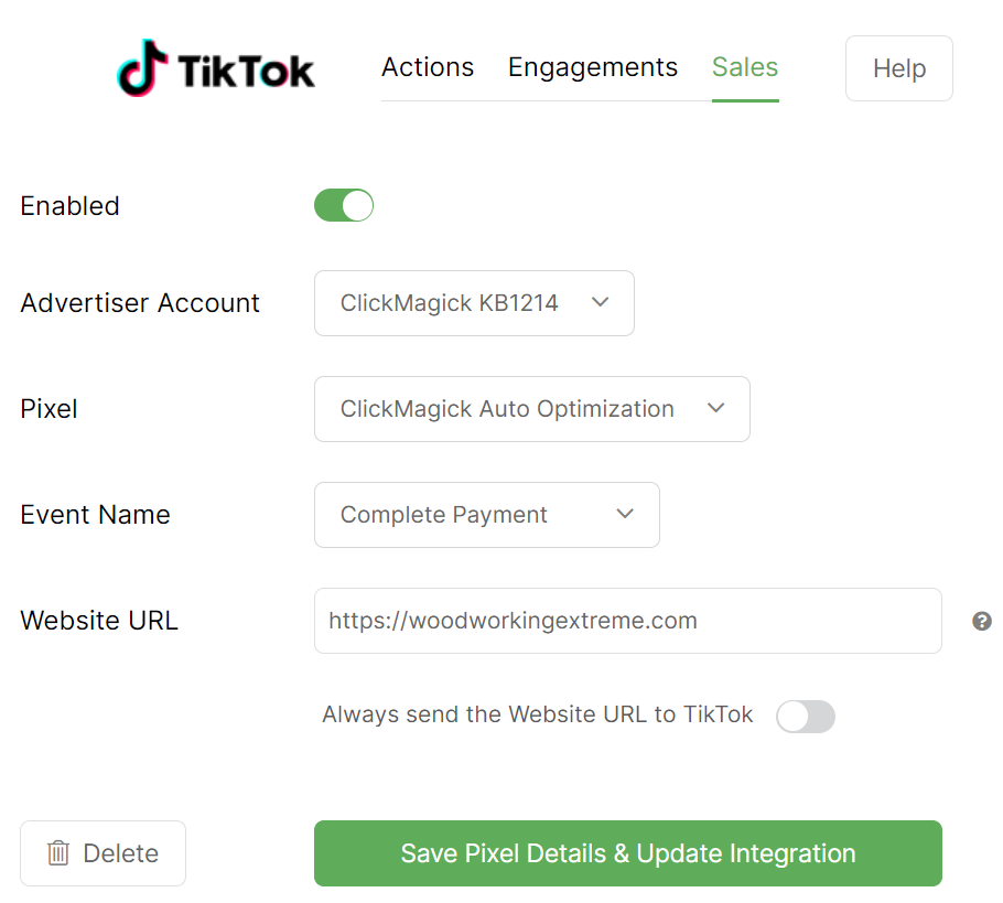Note: We’ll always pass the URL where a conversion occurred to TikTok’s API when one is available. When no URL is available — for example if you’re tracking affiliate sales via Postbacks — we’ll simply pass the Website URL you entered when you saved your pixel settings. If you want ClickMagick to always send the Website URL you entered, simply enable that option.