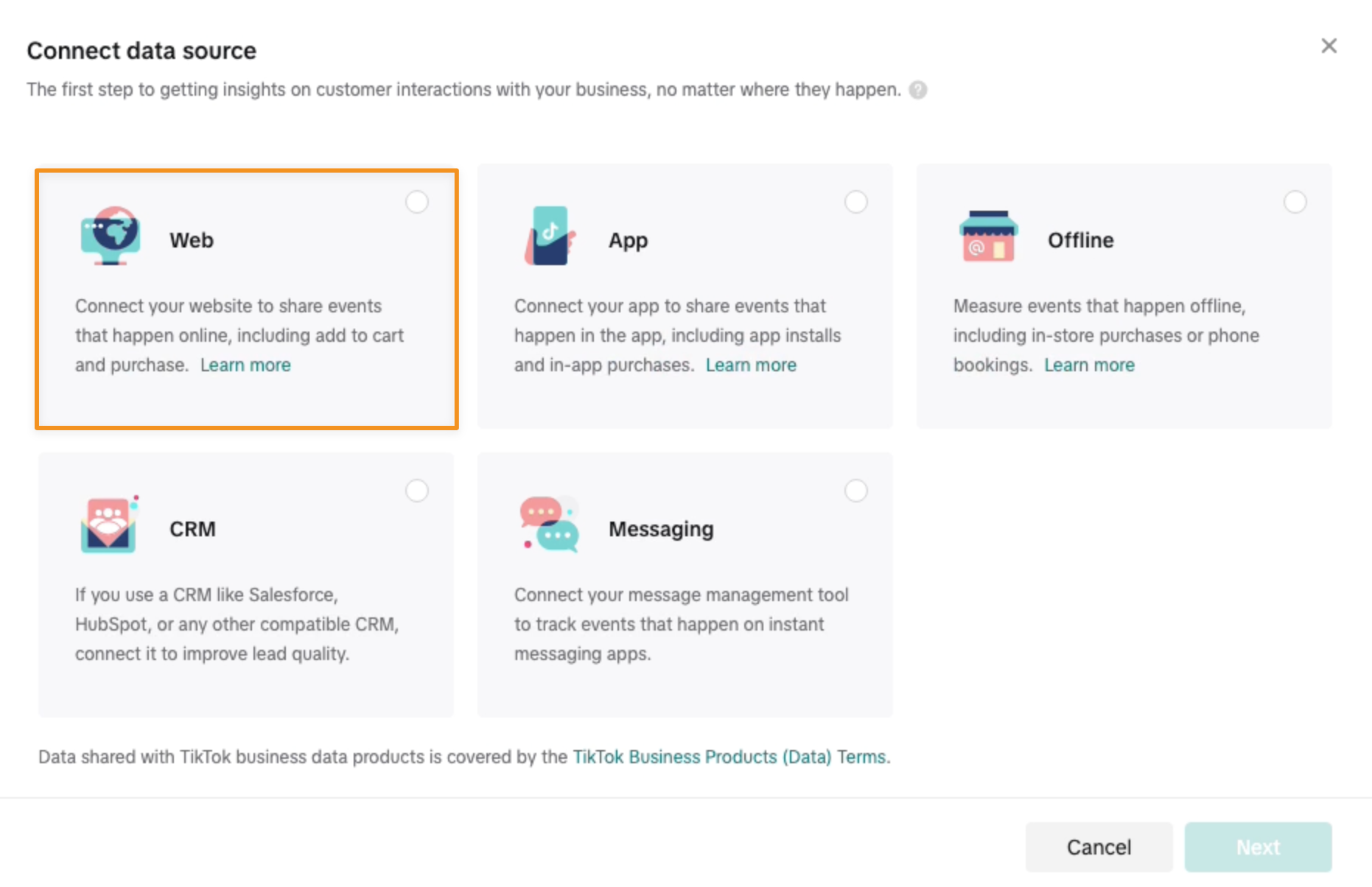 In your TikTok Ads account head to the Events Manager and then click on "Connect Data Source” button.