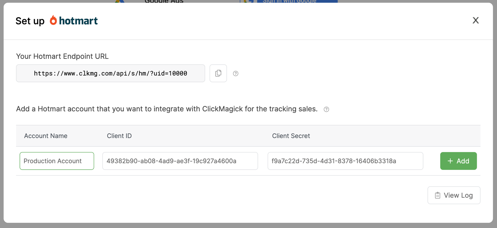 If you want to track more than one Hotmart account with ClickMagick, log into each of your Hotmart accounts and create credentials for each one, and add them to your ClickMagick Hotmart integration just like you added the first one.
