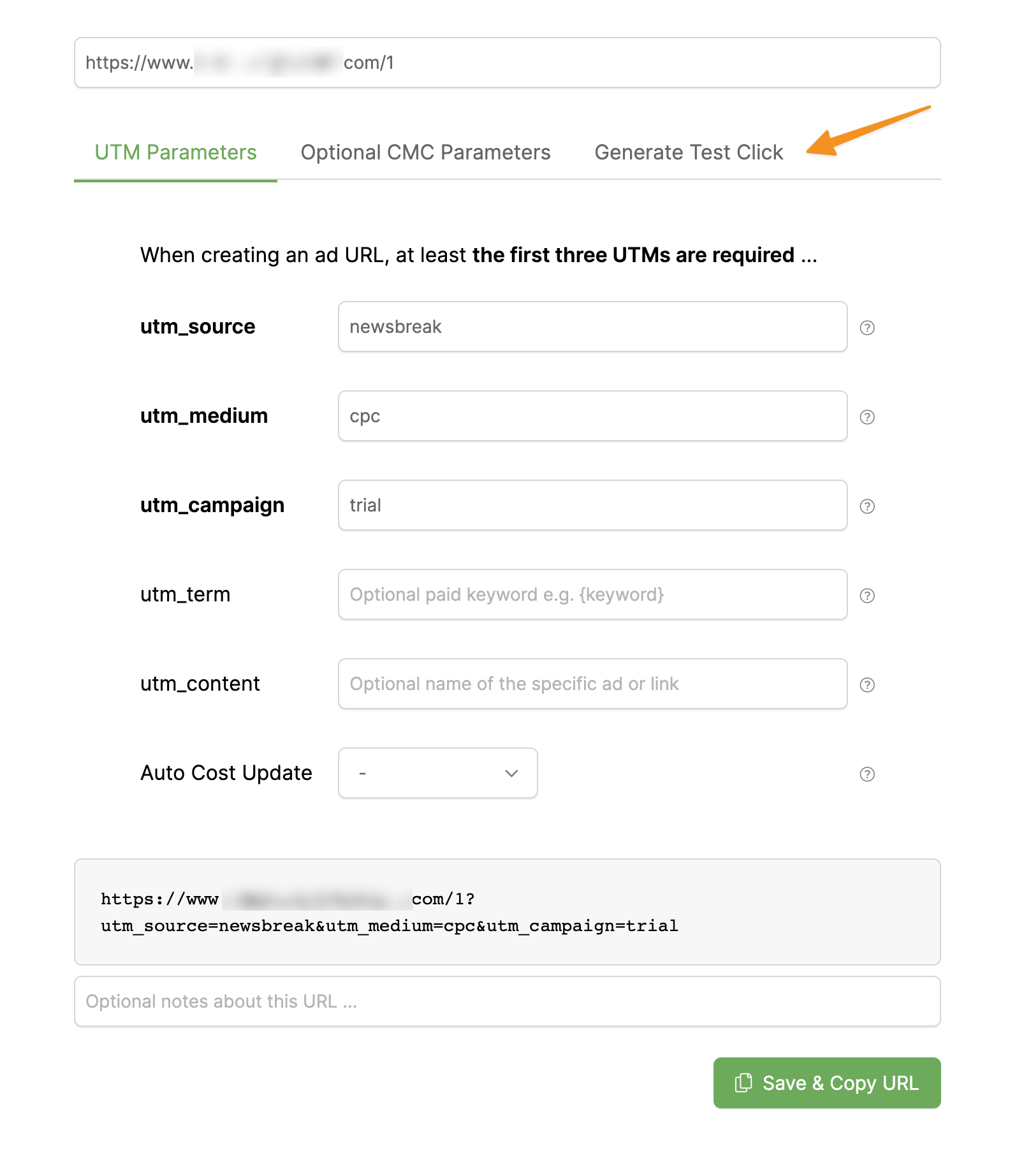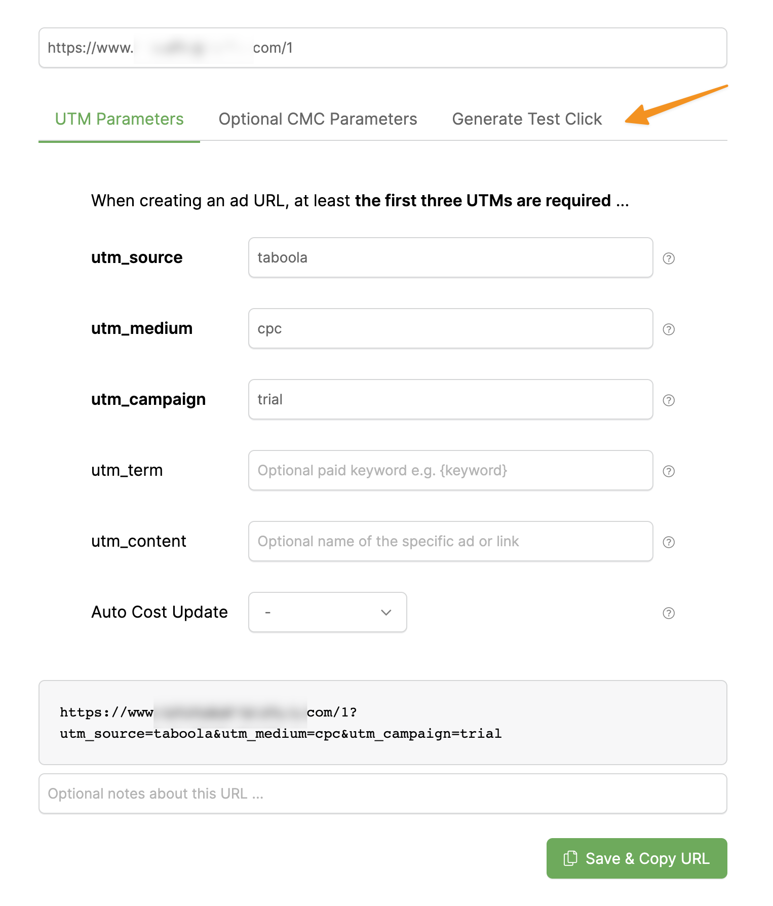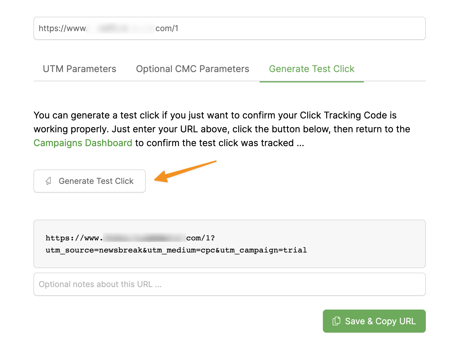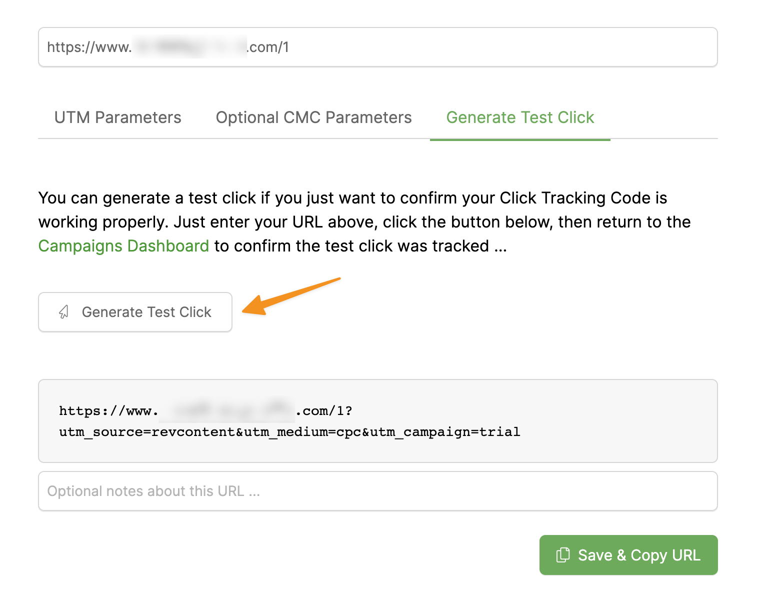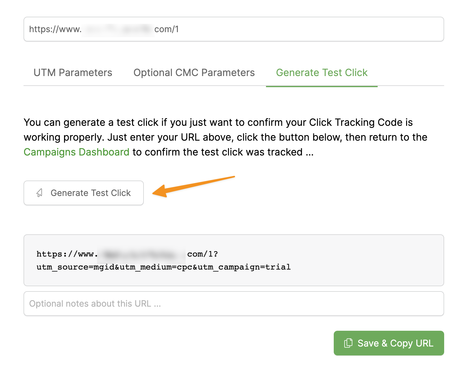 Go back to the URL Builder and enter the same URL like the one in the image above but add &cmc_goal=s at the end, like in the image below. Click on “Generate test click”.