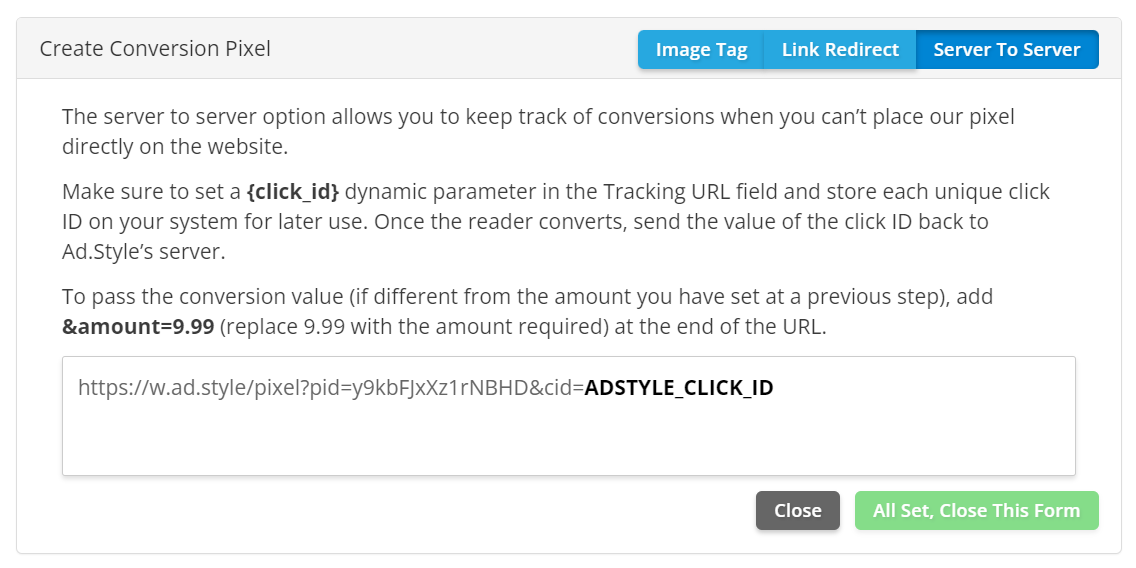 Ad.Style supports a handful of different tracking methods, so you can send conversion data back to them.