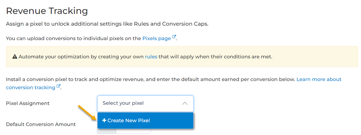 At the end of the page you'll see Conversion Pixel, click on the Create conversion pixel text: