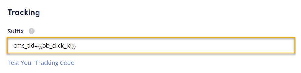 Edit your Campaign settings, and scroll down to the Tracking section. In the Tracking Code entry, add the unique Click ID token for Outbrain as shown below: