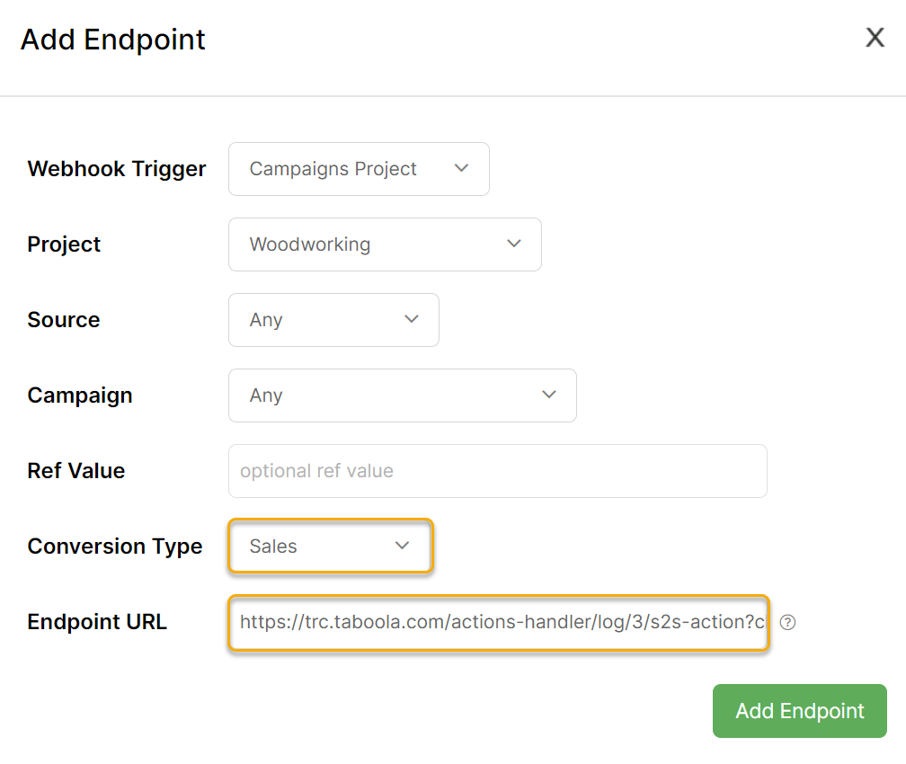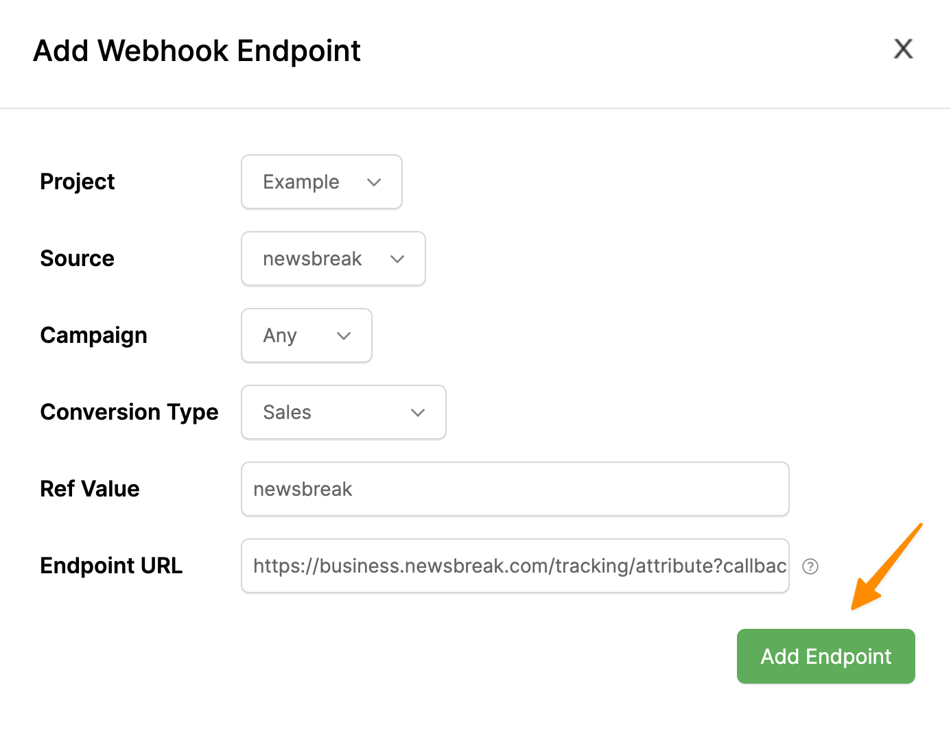 Note: If you’re using a different conversion event other than complete_payment, you will need to change the Endpoint URL to use that instead. For example, you may be using submit_form in Newsbreak, so your URL would contain &event_type=submit_form instead.