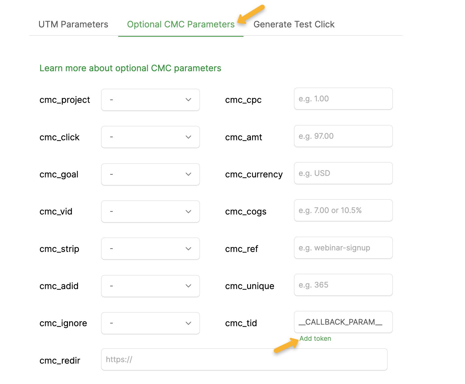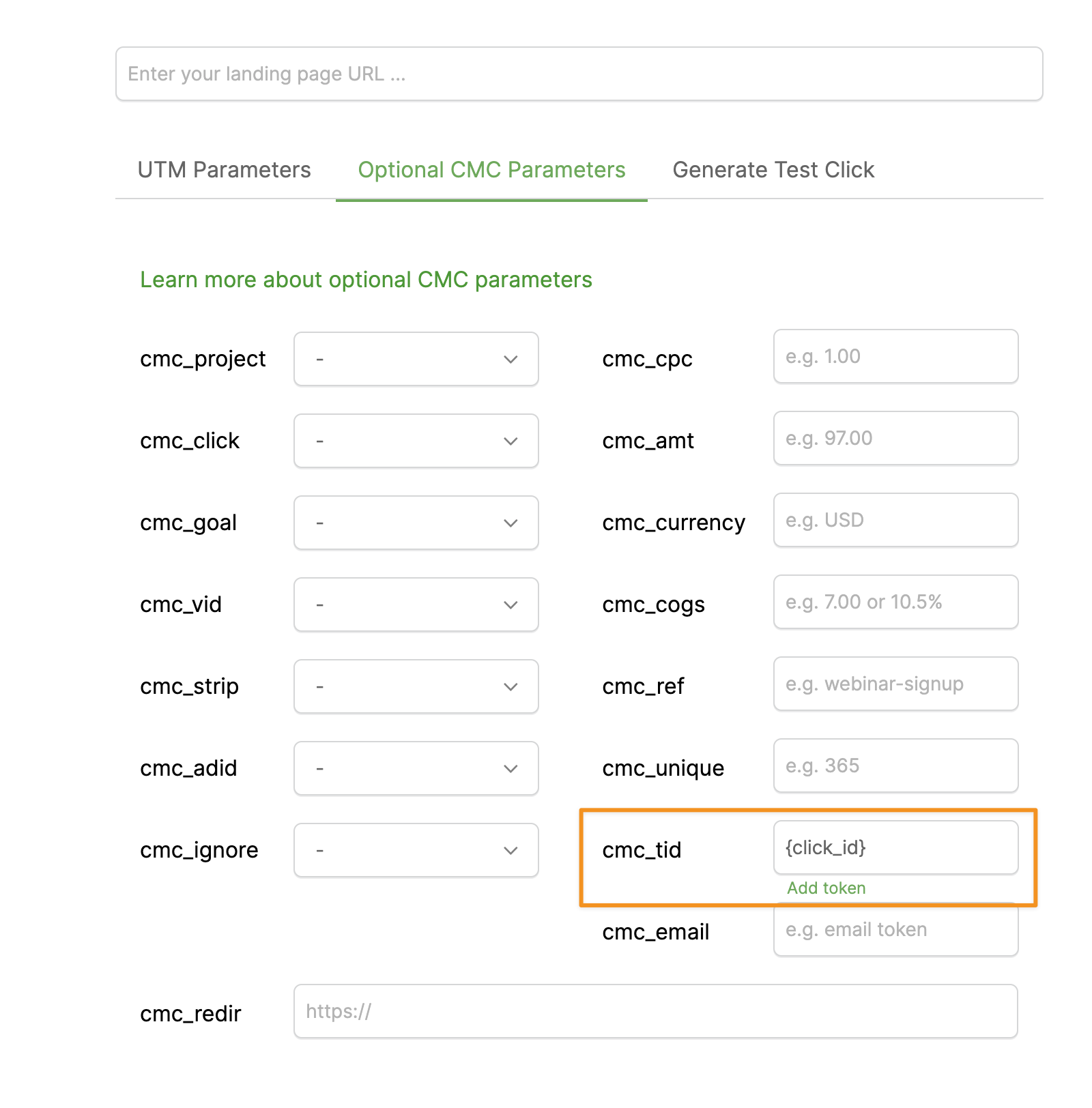 You also need to choose Taboola’s click ID token in the Optional CMC Parameters, under the cmc_tid field.