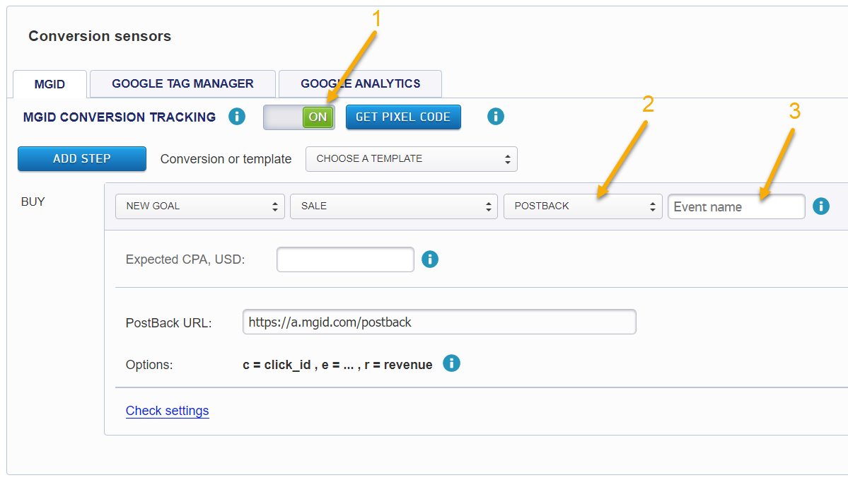 Step 2 – Make sure that “MGID CONVERSION TRACKING” is set to ON.