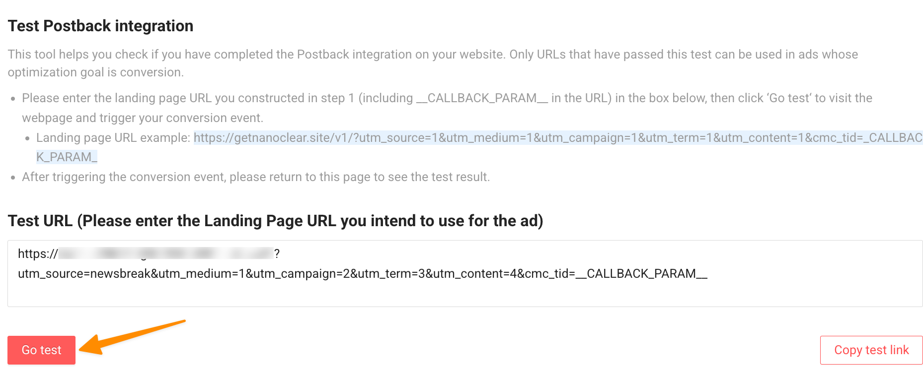 Go back to Newsbreak, paste your link in the “Test URL” field and click on the “Go test” button.