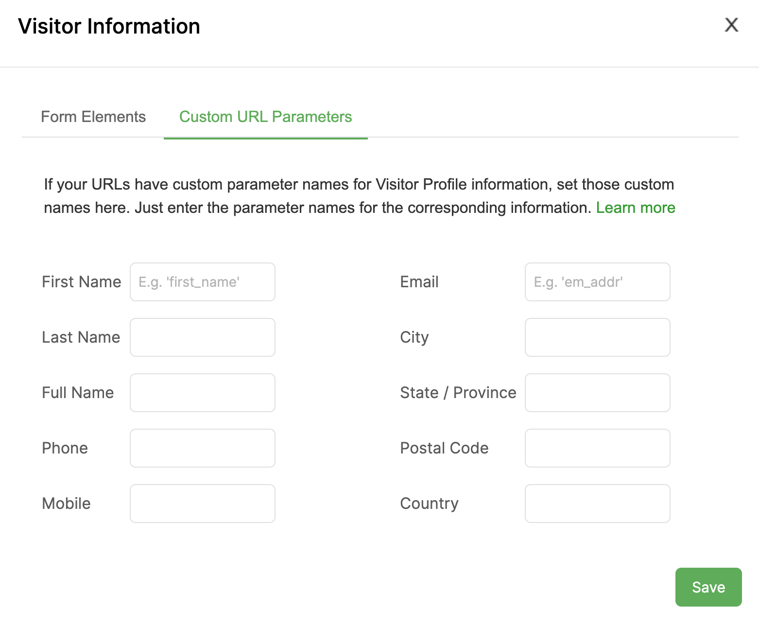For each type of Visitor Information, simply enter the custom parameter name for each piece of information exactly as it will appear in the URL.