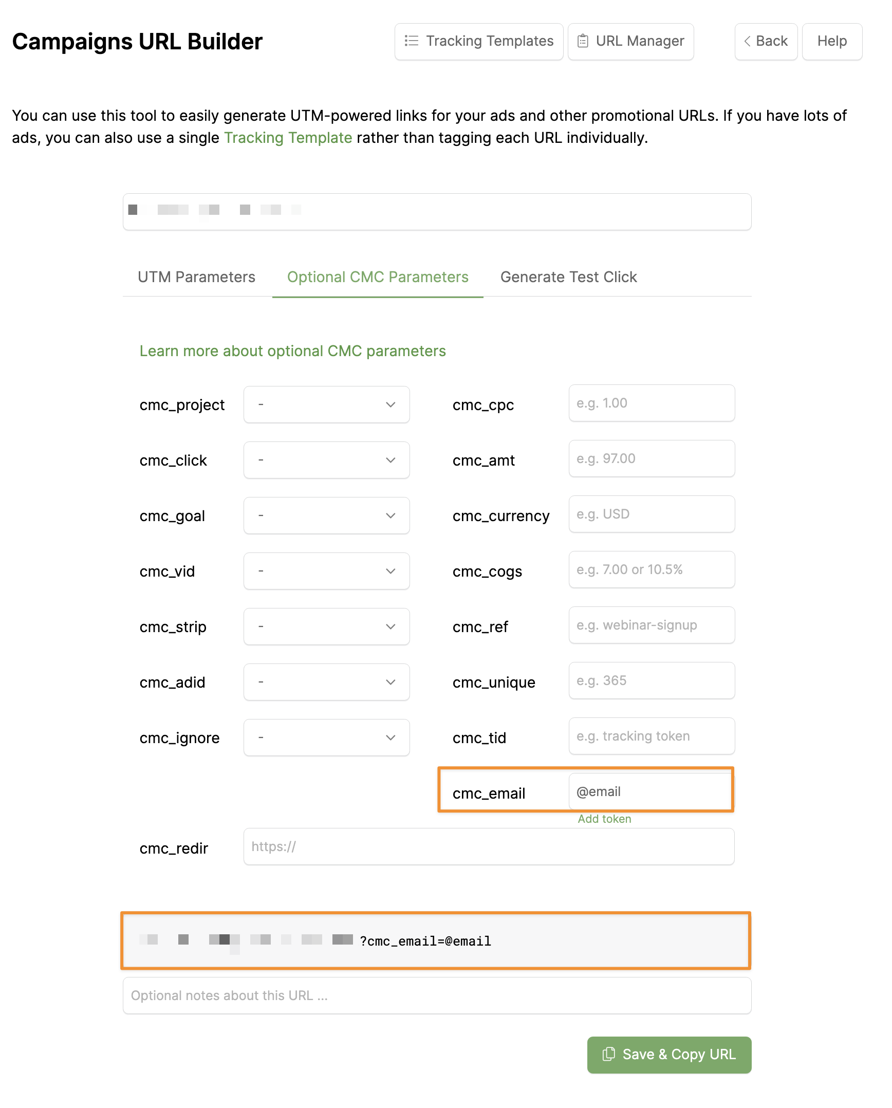 1. In ClickMagick, click on Tools > URL Builder. Paste in your Thank You Page URL, and on the Optional CMC Parameters tab, type "@email" in the cmc_email box.