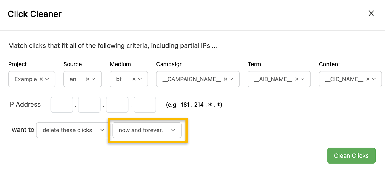 If you want to stop clicks with certain UTM parameters from showing up in your stats forever, you can select “now and forever” as shown below. This will instantly remove new clicks that come in with these UTM parameters.