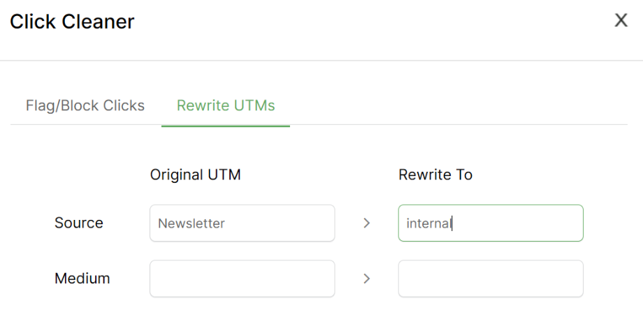 So you can simply set up a Click Cleaner rule to “rewrite” the UTMs for these clicks, and automatically change any clicks with a source of ActiveCampaign or Newsletter to utm_source=internal which is what you’d want in this example.
