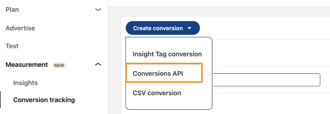 Go to Measurement, Conversion tracking, click on the Create conversion button and select Conversion API.
