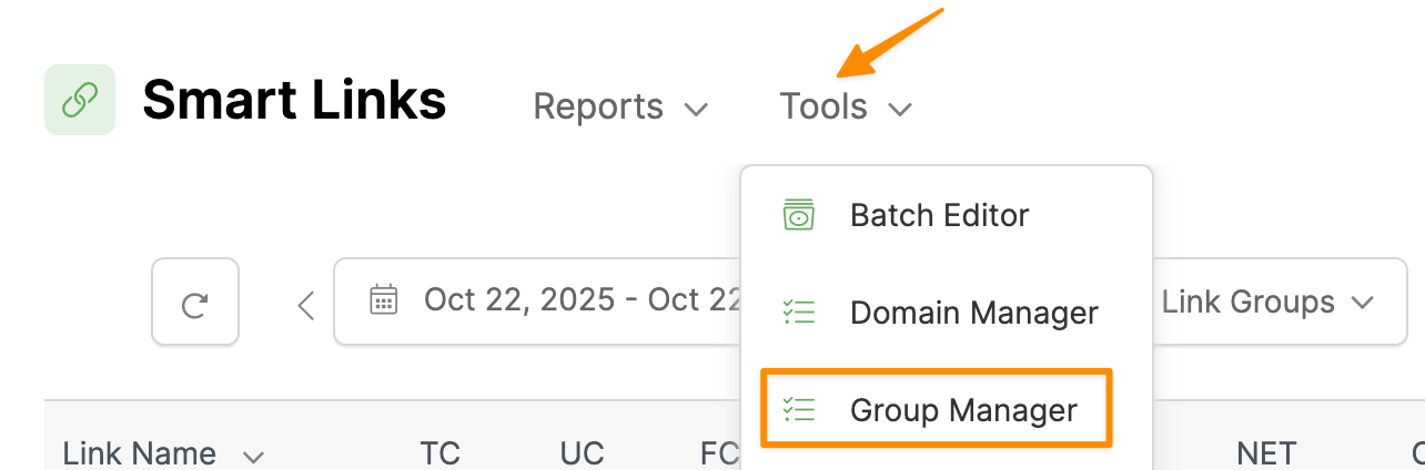 The Group Manager is found in the Smart Links or Rotators Tools menu, where you can set up and manage link groups and rotators groups that’ll help you better organize and manage all your different links.
