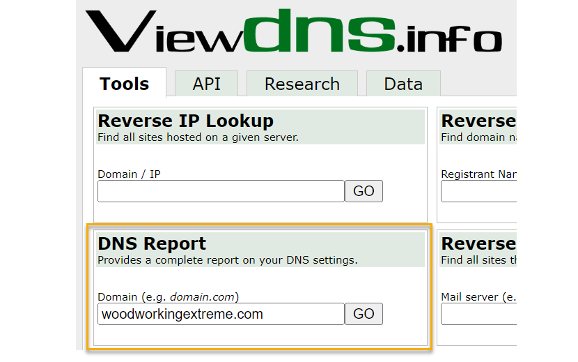 Go to ViewDNS.info, enter your domain in the DNS Report box and click the Go button: