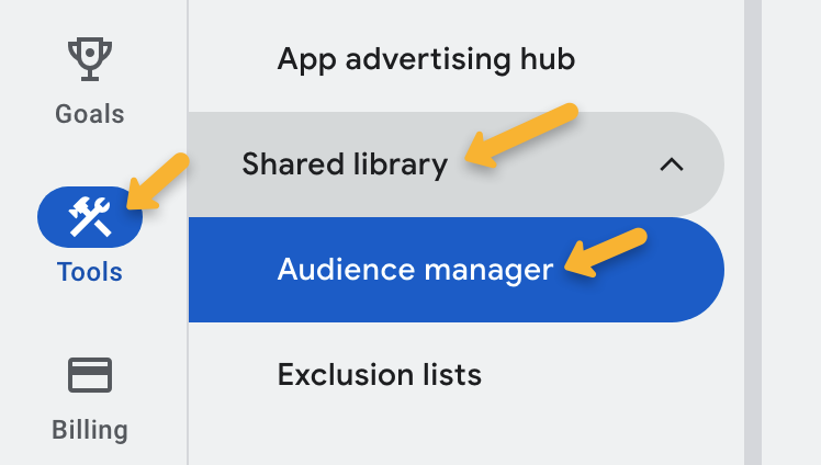 2. Go to your Google Ads dashboard, click on the Tools menu, then select “Shared Library” > “Audience Manager”.