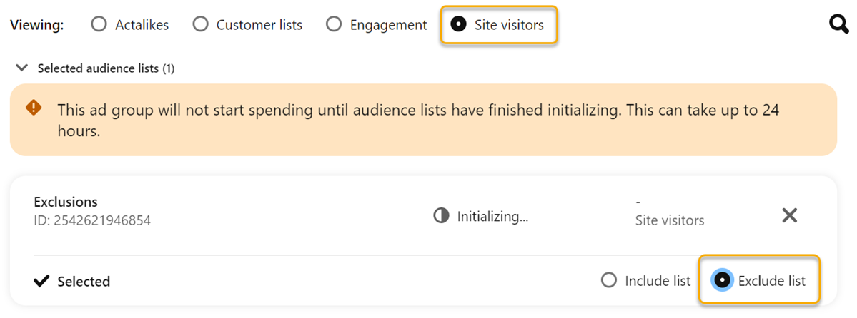 7. Choose the “Site Visitors” option, and choose your custom audience that you just created. Then, choose “Exclude list” underneath that list.