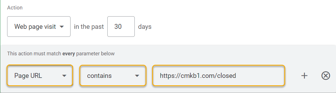 And lastly, add in the URL for your exclusion page in the empty box to the right of “contains”.