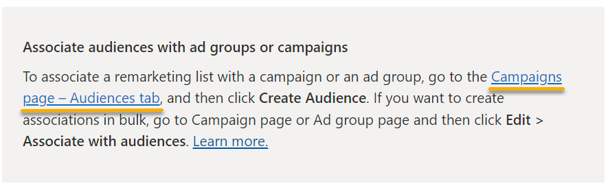 6. Now you need to associate this audience with a campaign. The easiest way to get there is within the box at the top that says “Associate audiences with ad groups or campaigns”. In that box, click on the link that reads “Campaigns page – Audiences tab”.