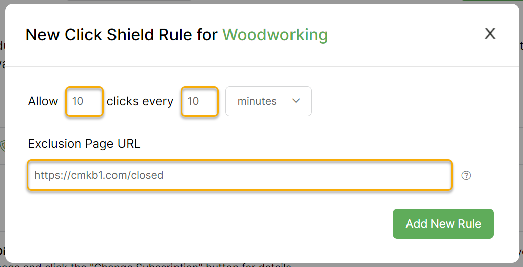 When you set up your Click Shield rules, each rule has an associated “Exclusion Page URL.”