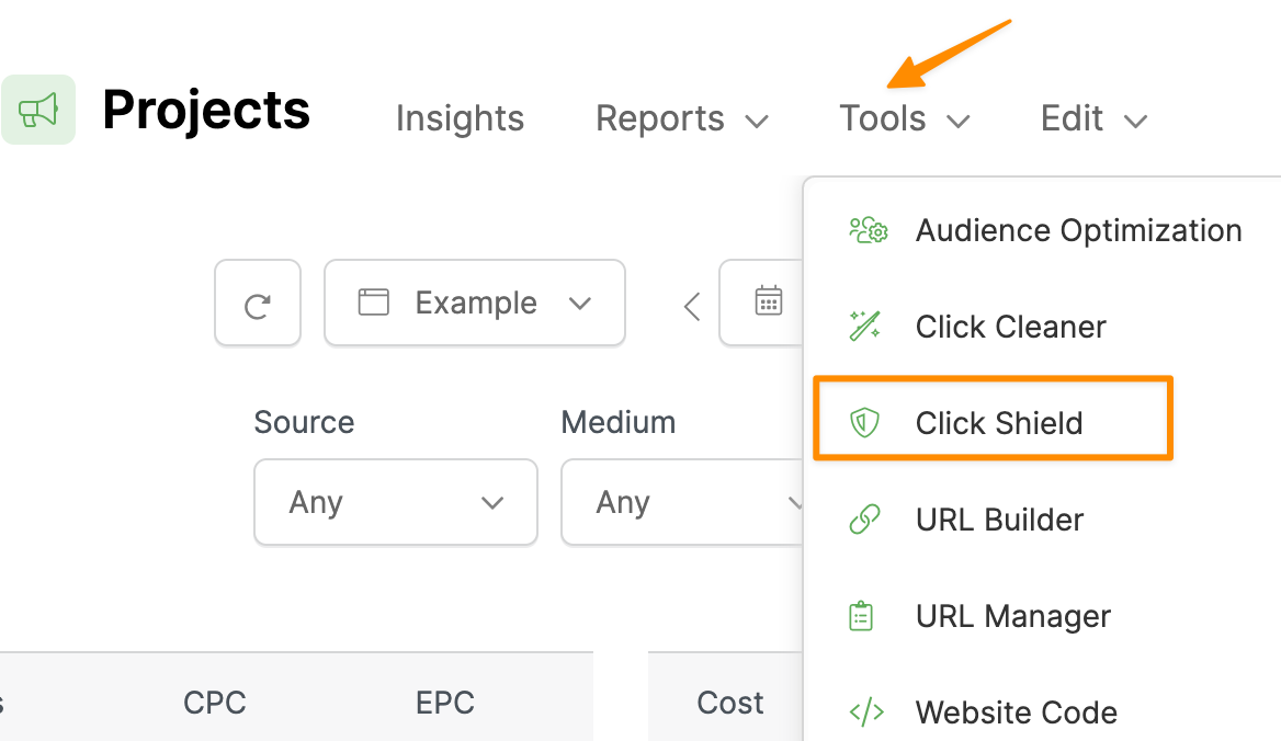 7. Go back to your ClickMagick Project Dashboard, expand the Tools menu, and then click on “Click Shield”.
