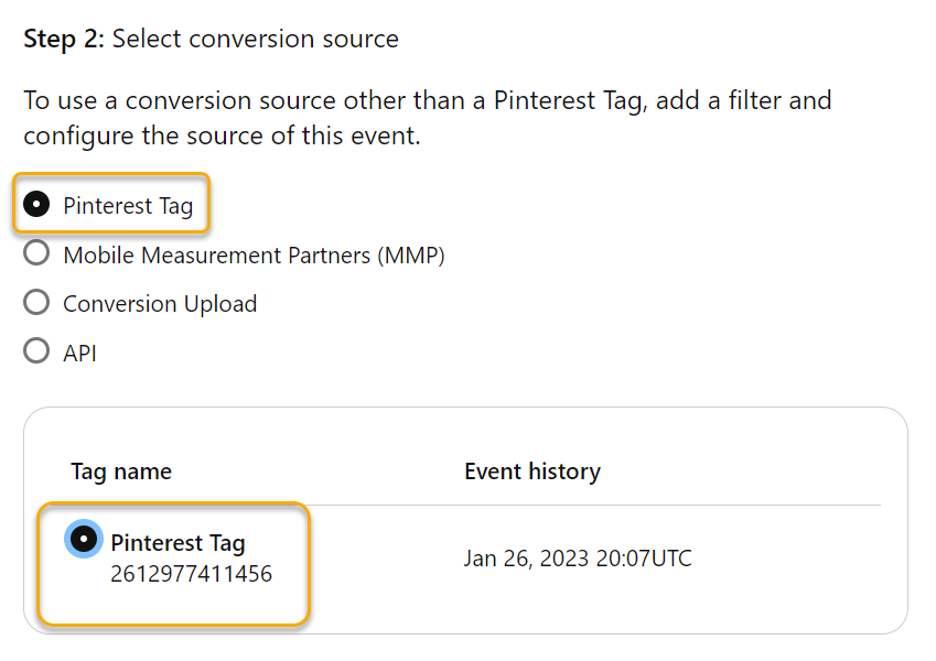 4. Pick which ever conversion source you want to use. Most likely it will be Pinterest Tag, but it depends on how you have your tracking set up for Pinterest. For this article, we’re using the Pinterest Tag.