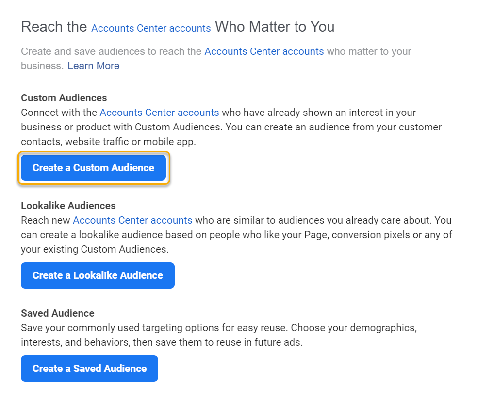 1. Go to your Meta Business Manager dashboard, then click on “Audiences” on the left, then click on “Create a Custom Audience”.