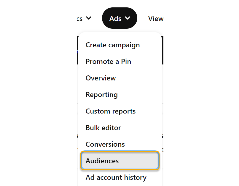1. Go to your Pinterest Ads dashboard, expand the Ads menu and then click on “Audiences”.