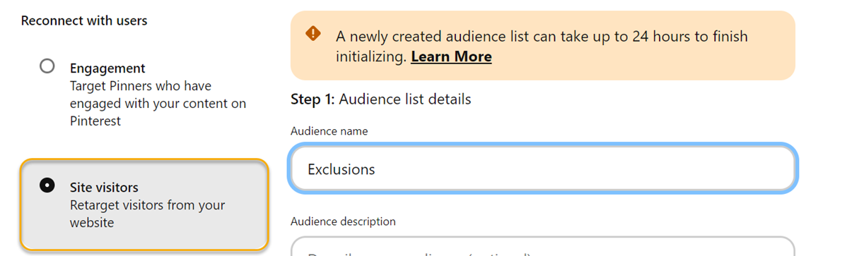 Note: You’ll notice the warning stating it can take up to 24 hours. That’s standard for new custom audiences in Pinterest Ads. You’ll see this again later in this article and it is their notice to you that it can take up to 24 hours to initialize. This is normal and not related to any missed step or anything you did wrong. If you already had a custom audience created previously, you likely will not see this warning.