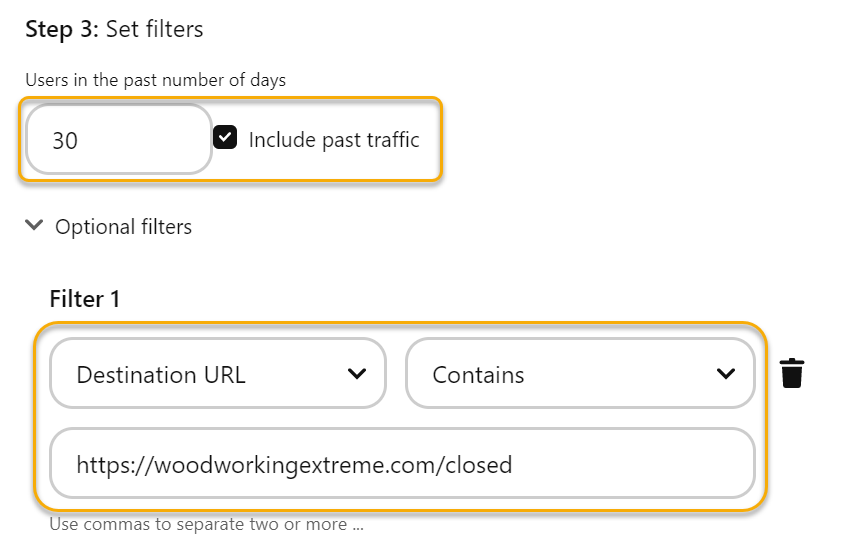 Then, in the optional filters you will want to pick “Destination URL”, “Contains”, and then add your exclusion page URL in the box.
