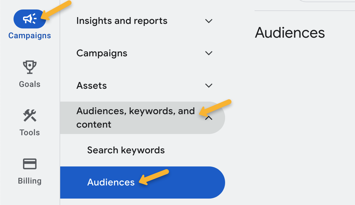 12. In Google Ads, go to “Campaigns”, then go to “Audiences, keywords and content” > “Audiences” on the left.