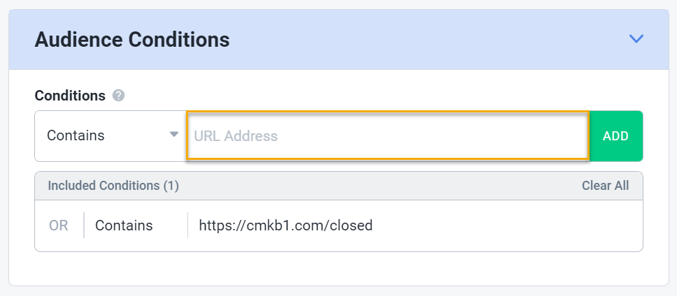 5. For the audience conditions, add the URL of your exclusion page to the box and click on the “Add” button. If done correctly, it should look something like this.