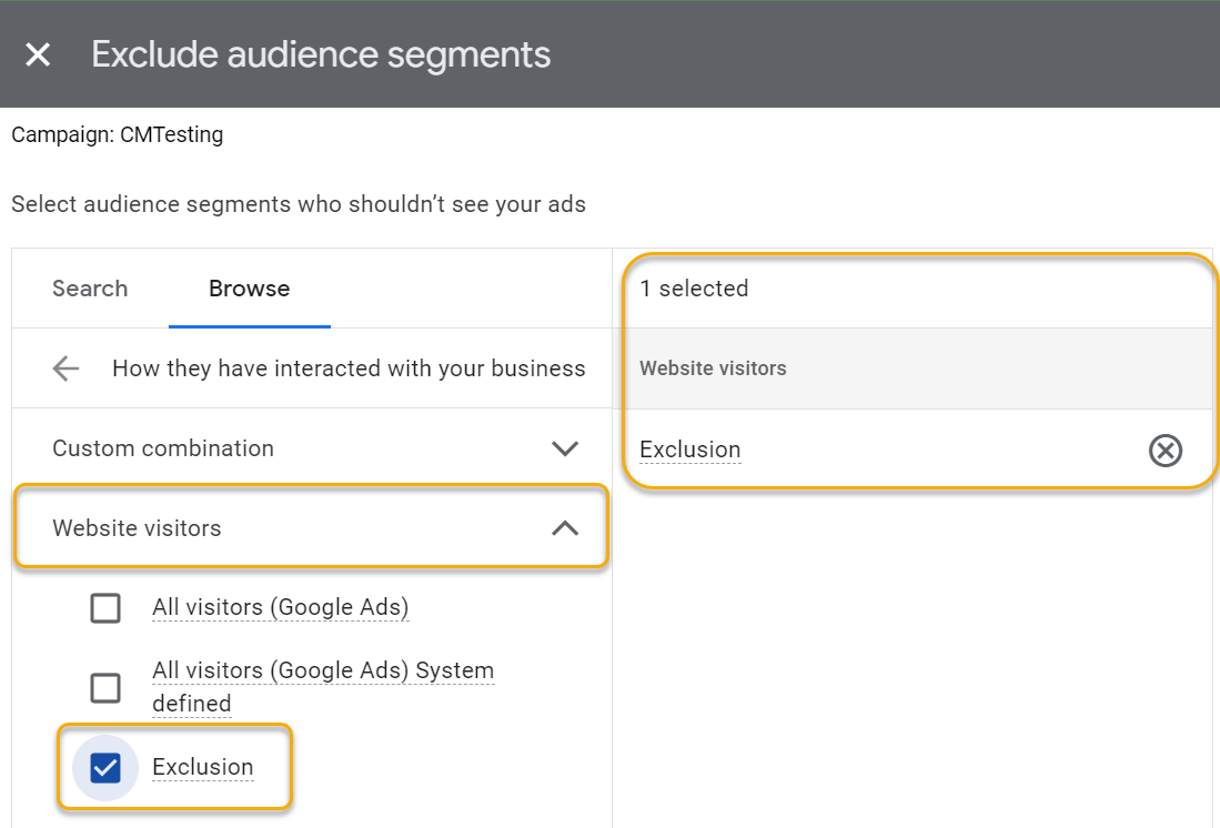 16. Choose “Website Visitors”, and then choose the custom list you created. In this case, we called it “Exclusion”.